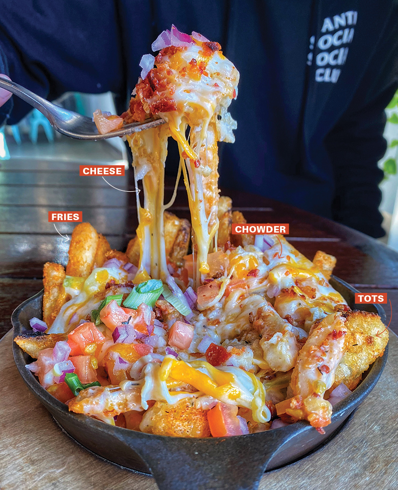 Chowder Frots feature Cajun fries and tater tots smothered with chunky housemade clam chowder, melted cheddar cheese, bacon bits, red onion and diced tomatoes, $12.