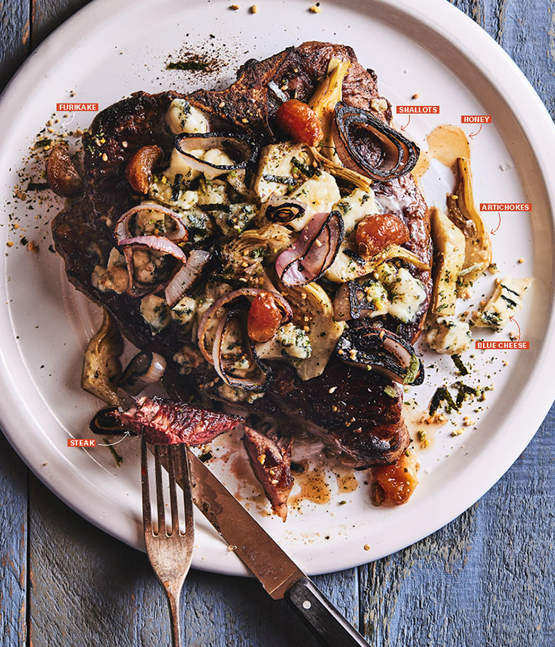 Porterhouse steak from Clark’s Farm in Howard County, Maryland, is topped with caramelized shallots, artichoke hearts, chunky garlic, Asher Blue cheese, honey and furikake.