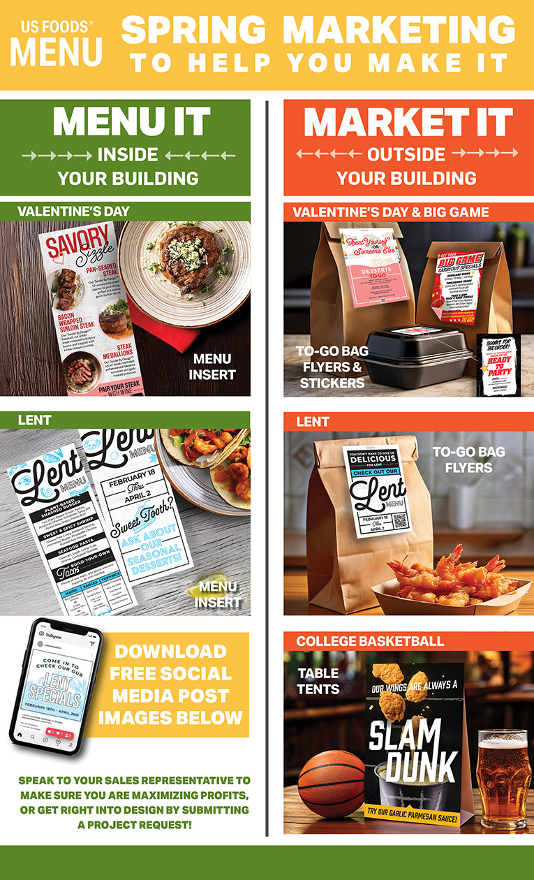 The holidays may be over, but the busy season is still upon us! From sporting events like the Big Game and college basketball to seasonal holidays like Valentine’s Day, and Lent, there’s no shortage of marketing opportunities to help you attract diners. Whether you want to highlight in-house seasonal specials or boost your takeout business, the US Foods® Menu team has the menu and marketing expertise to help your operation stand out from the crowd.